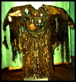 ![]() He Who Runs Swifter Than a Reindeer The Evenki people number about 30,000 and occupy a huge territory in north eastern Siberia. The name means "he who runs swifter than a reindeer". Traditional Evenki clothing was designed for the cold dry Arctic climate, the nomadic way of life, and travel on foot or skis. Winter clothing was made from reindeer and moose skins. Soft newborn reindeer skins were used for loincloths that were worn with reindeer skin leggings and thigh-high boots. This combination provided ideal protection from the snow. Parkas were open in front and had pleats at the back so that they would hang comfortably when riding a reindeer, and all of this might be topped with close fitting reindeer caps that often had the reindeer ears left in place! An Evenki shaman's clothing was more elaborate in decoration, and was often adorned with many symbolic references to flight, such as metal pendants and tassels made with bird wings and tails (picture).