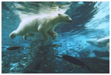 ![]() Thar She Blows! The White... Bear? The polar bear is the only bear considered to be a marine mammal. Why? 1. They're great swimmers. They've been clocked as fast as 6 miles / 10 km per hour, and have been known to swim more than 60 miles / 100 km without a rest. 2. Their massive forepaws are partially webbed, and propel them through the water dog-paddle style. The hind feet and legs are used as rudders. 3. A thick layer of blubber, 3-4 inches/7-10 cm thick, not only keeps the bear warm in icy cold water, but adds to its bouyancy as well. 4. The bear's fur protects it like a diving-suit. It easily shakes free of water after a swim, and ice doesn't stick to it. 5. They have excellent underwater vision. 6. The bear's nostrils close when under water. (If you've ever had water up your nose, you'll know what an advantage that is.)