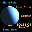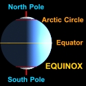 EQUINOXTwo times of the year when night and day are about the same length. The Sun is crossing the Equator (an imaginary line around the middle of the Earth) and it is an equal distance from the North Pole and the South Pole. SPRING EQUINOX: The first day of the Season of Spring - and the beginning of a long period of sunlight at the Pole. In the northern hemisphere: MARCH 20 (the Sun crosses the Equator moving northward). In the southern hemisphere: SEPTEMBER 22 (the Sun crosses the Equator moving southward). AUTUMN EQUINOX: The first day of the Season of Autumn - and the beginning of a long period of darkness at the Pole. In the northern hemisphere: SEPTEMBER 22 (the Sun crosses the Equator moving southward). In the southern hemisphere: MARCH 20 (the Sun crosses the Equator moving northward). |
